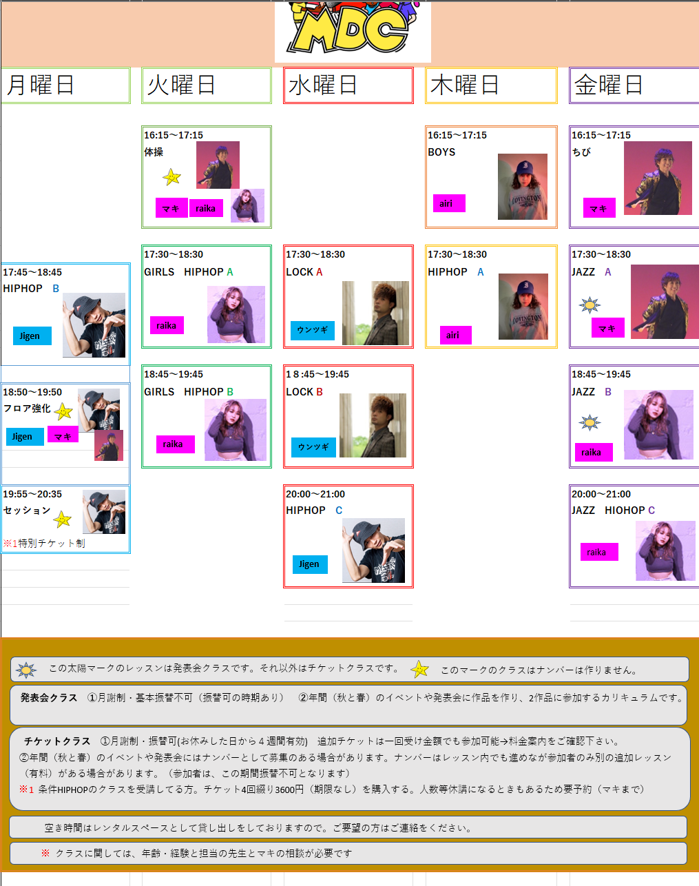 2025年6月6日 / 最終更新日時 : 2025年6月6日 tudumi maki 未分類 HIPHOPのクラス編成について 今年度のメンバーの移動により変更します。 A・Bクラスに関してレベル別ではなく クラスメンバーの平均年齢・担当の先生の違い・クラスの雰囲気等で生徒様の希望・担当の先生・マキと相談のうえ決めます。 現時点ではAクラスの方が […]